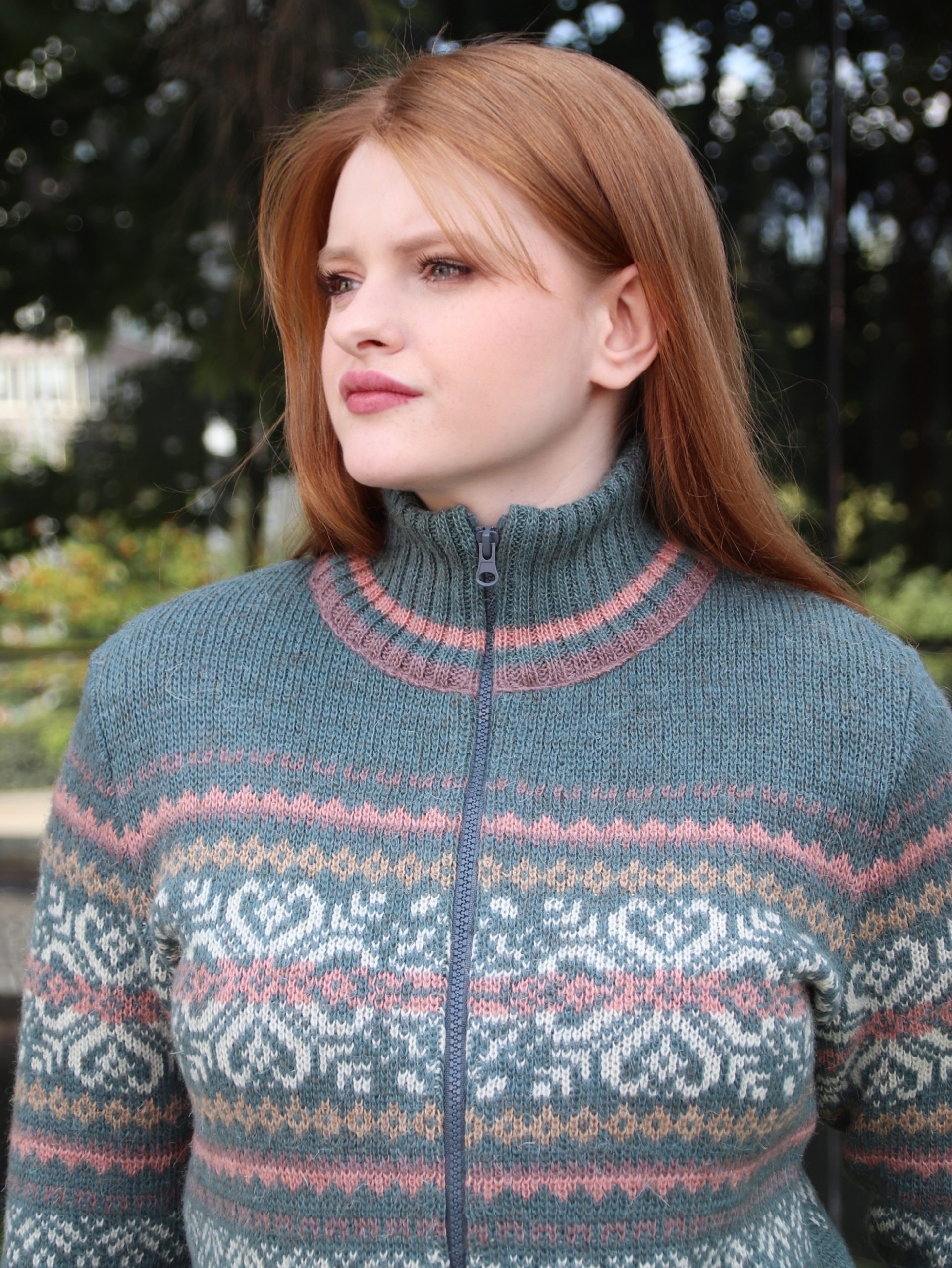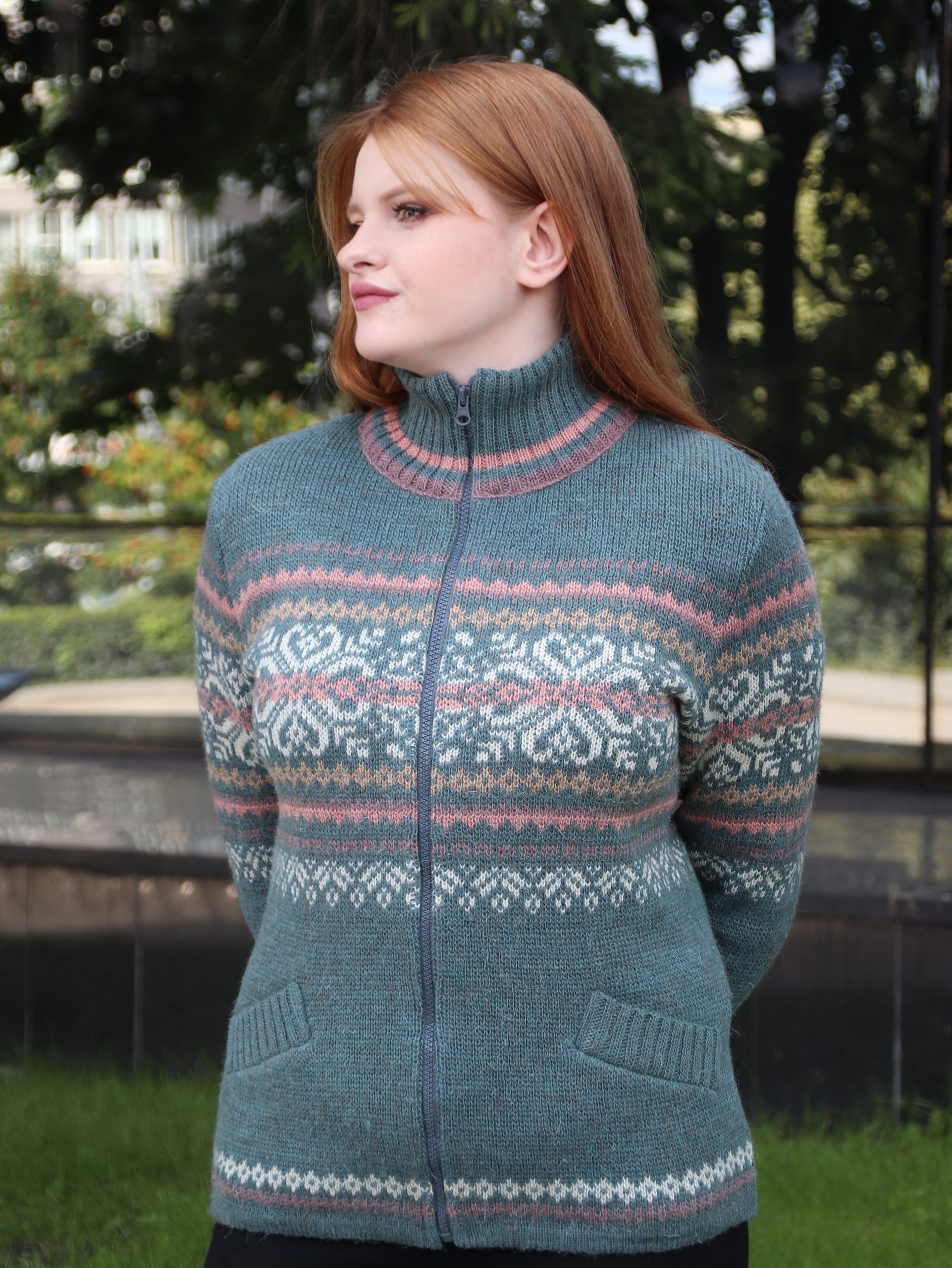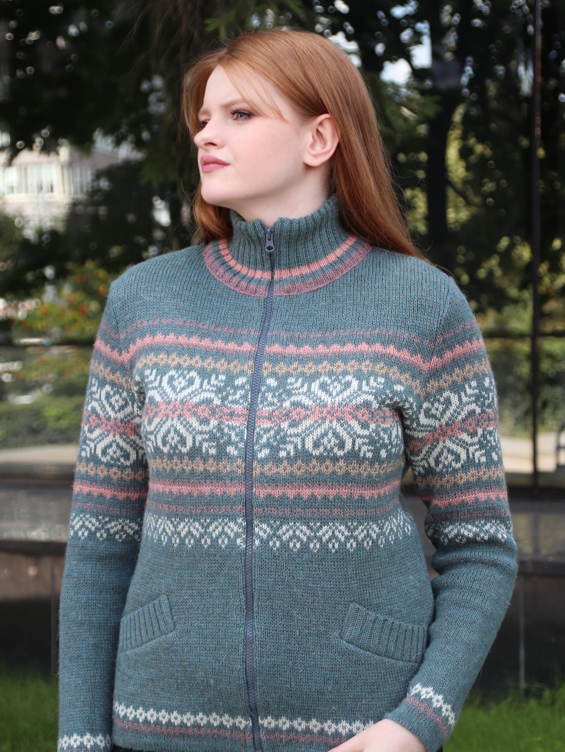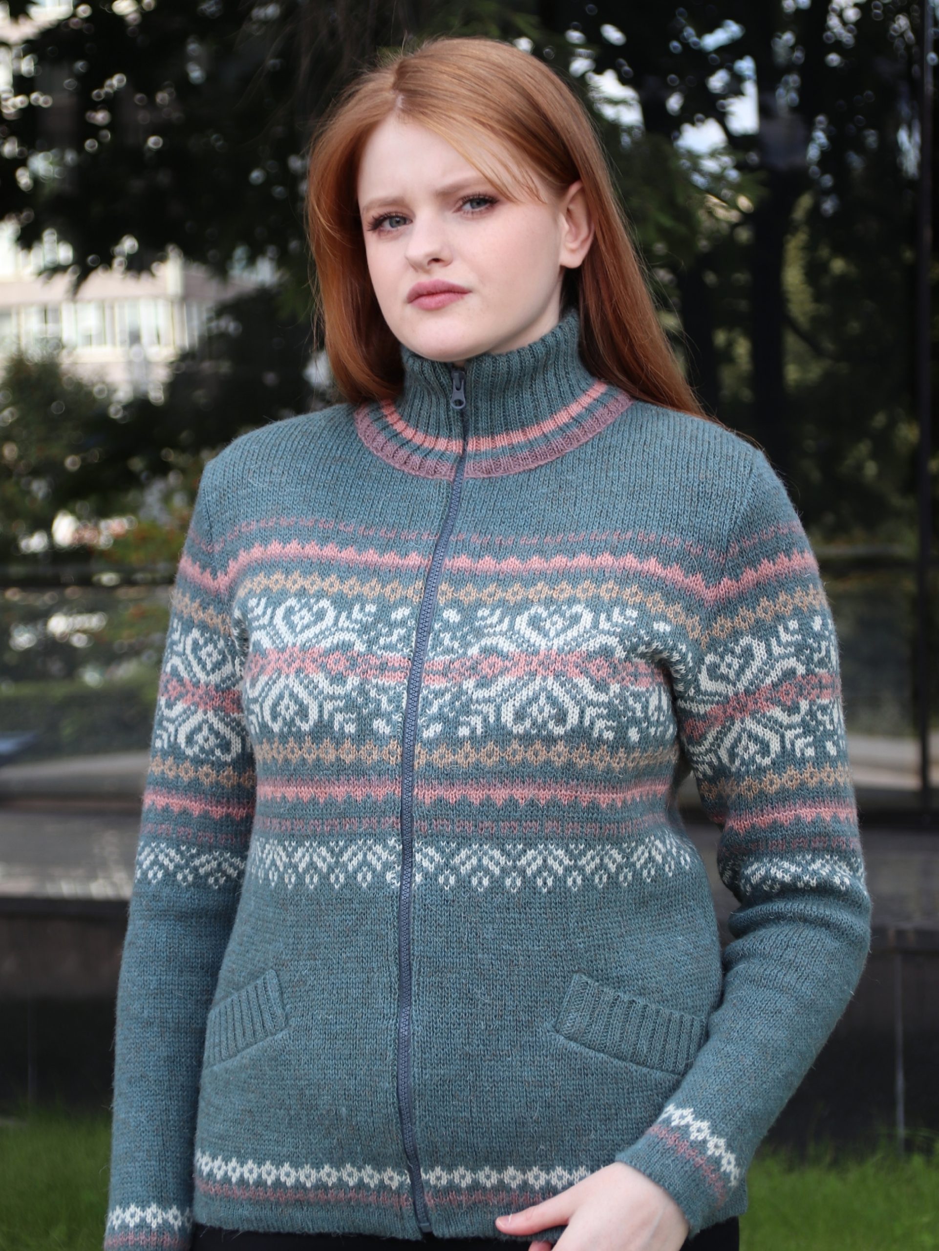 Шерстяной кардиган для женщин без капюшона, приталенный с втачными рукавами и карманами в рамку. Связан из 100% шерсти в спортивном стиле с жаккардовым рисунком.