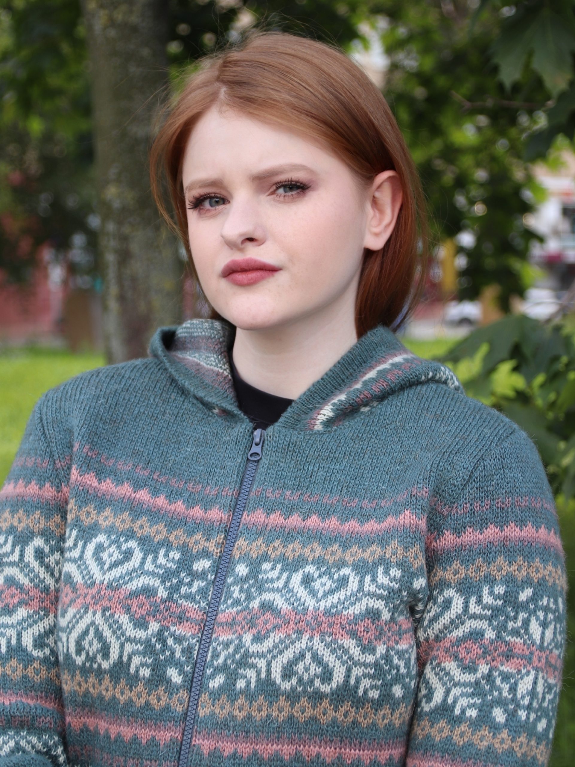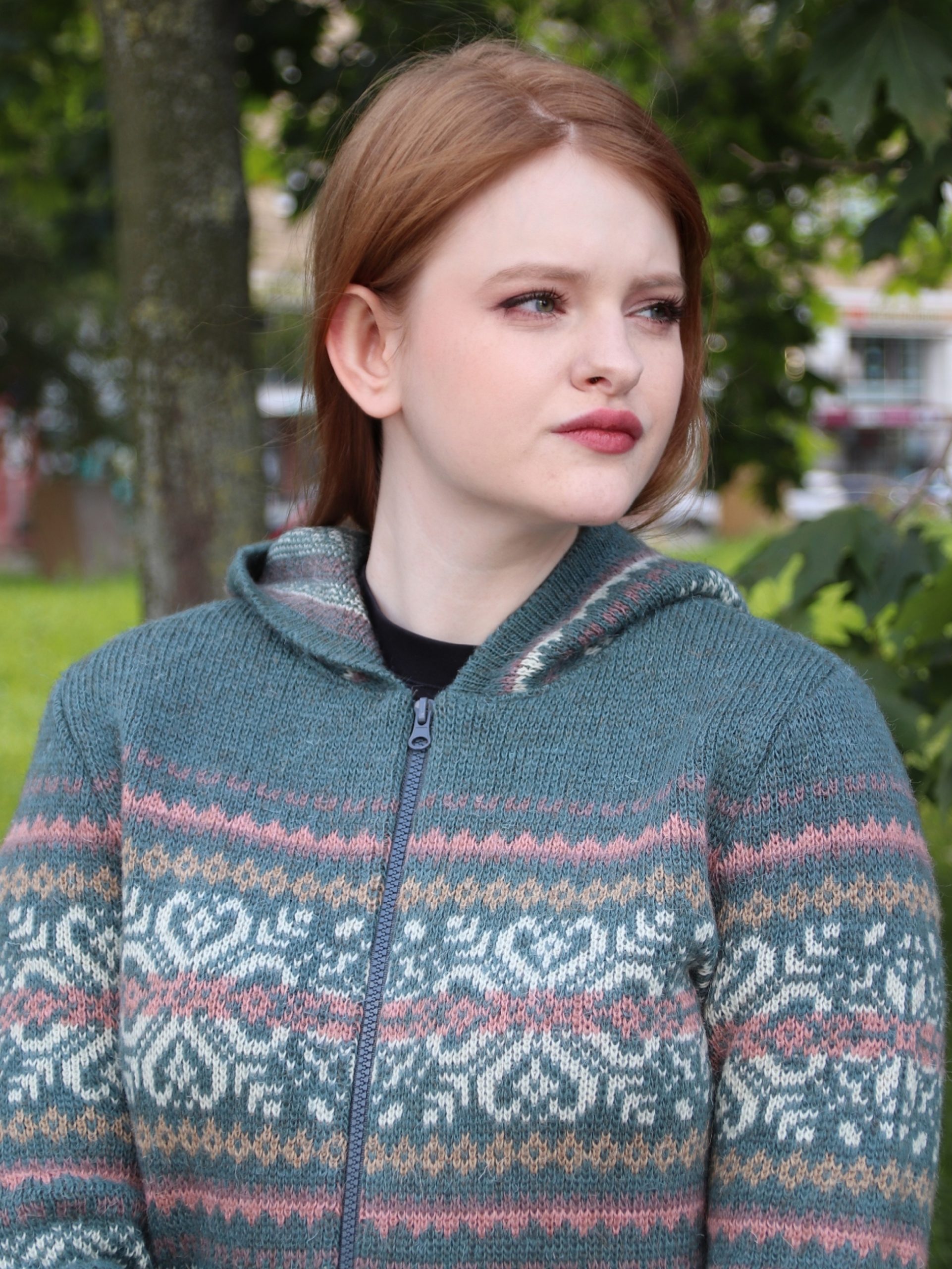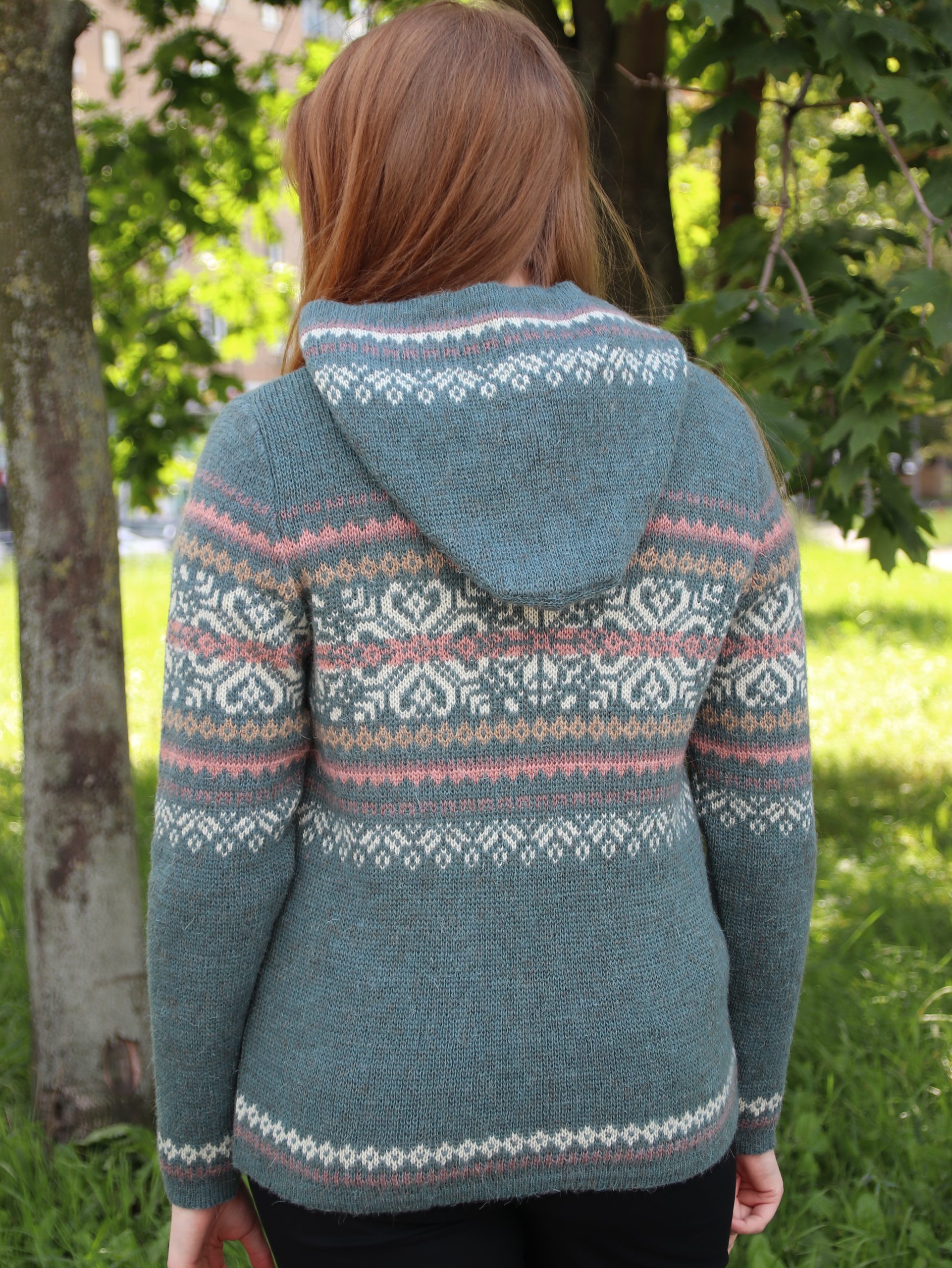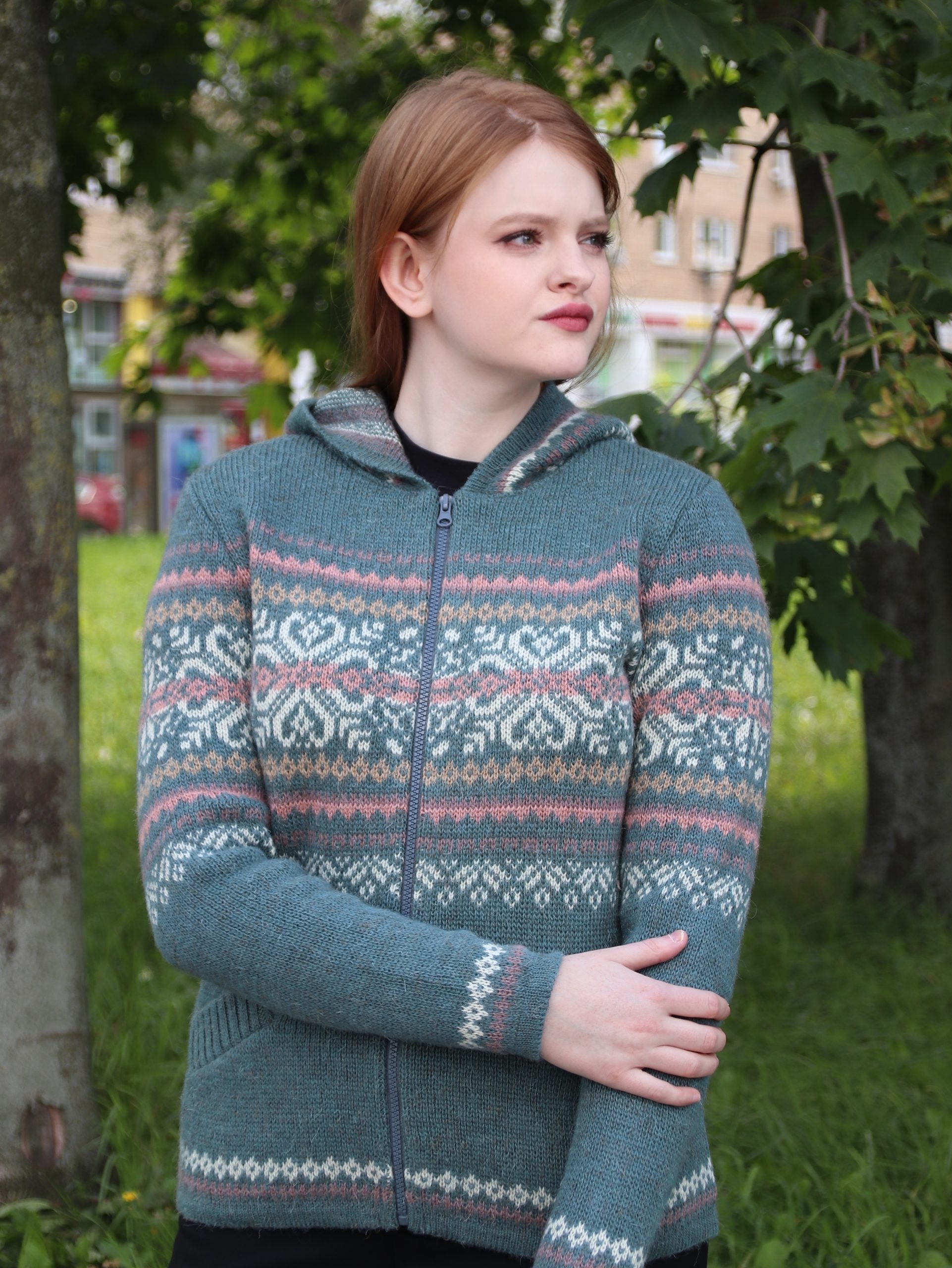 Шерстяной кардиган для женщин с капюшоном, приталенный с втачными рукавами и карманами в рамку. Связан из 100% шерсти в спортивном стиле с жаккардовым рисунком.