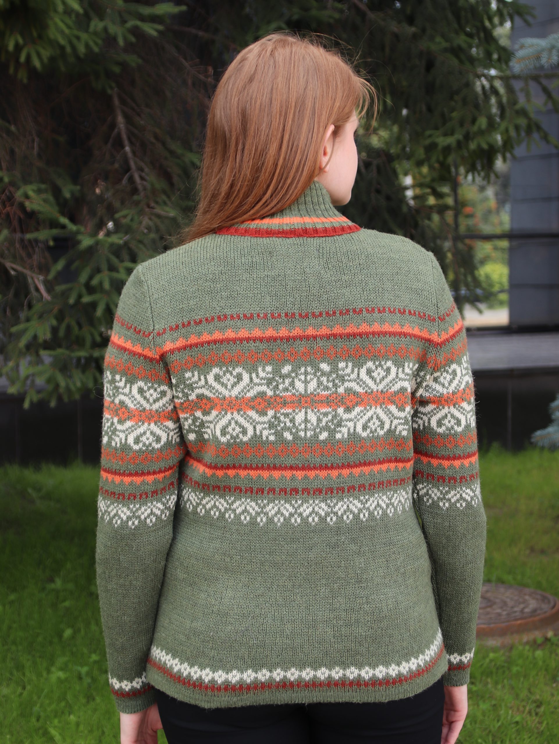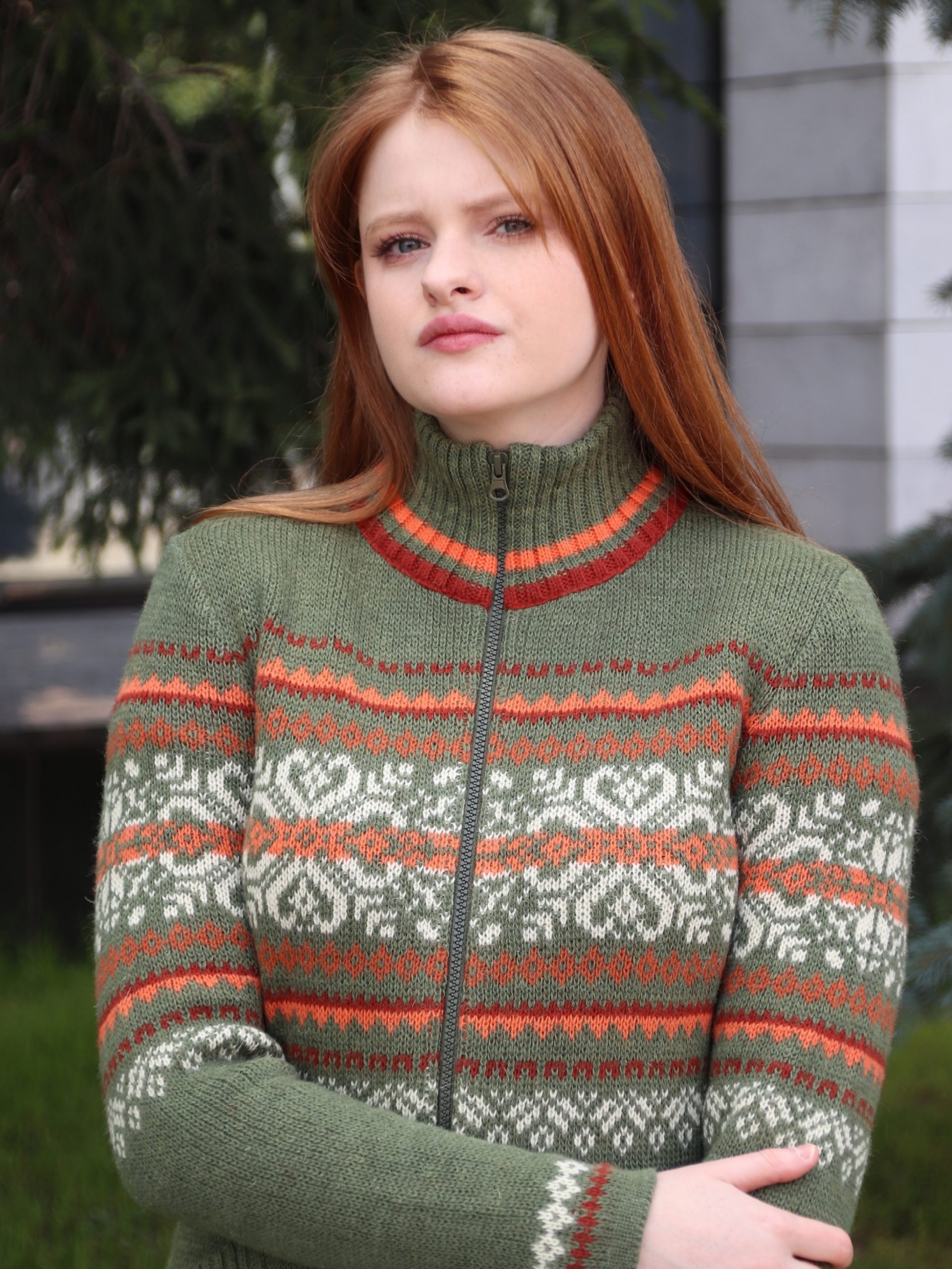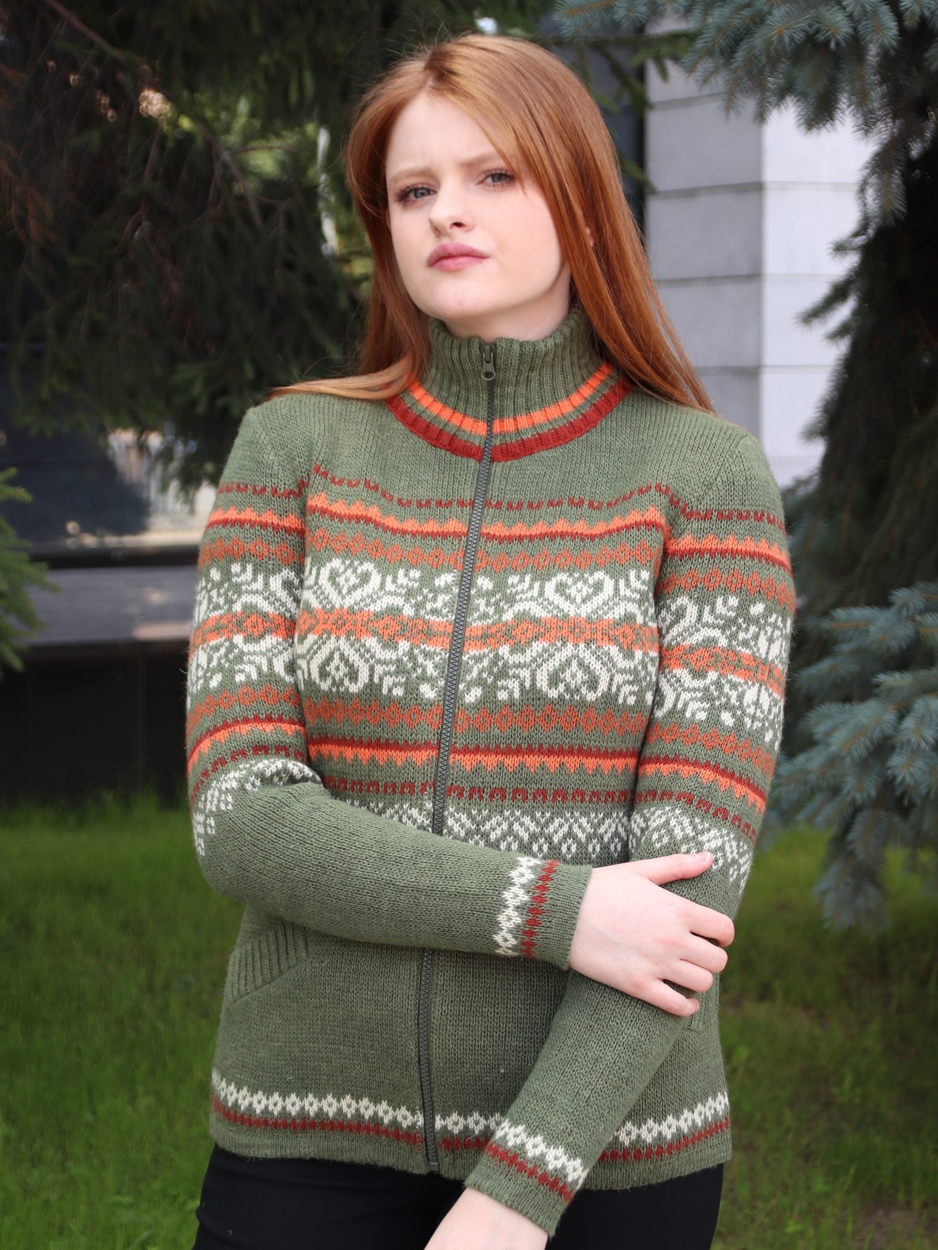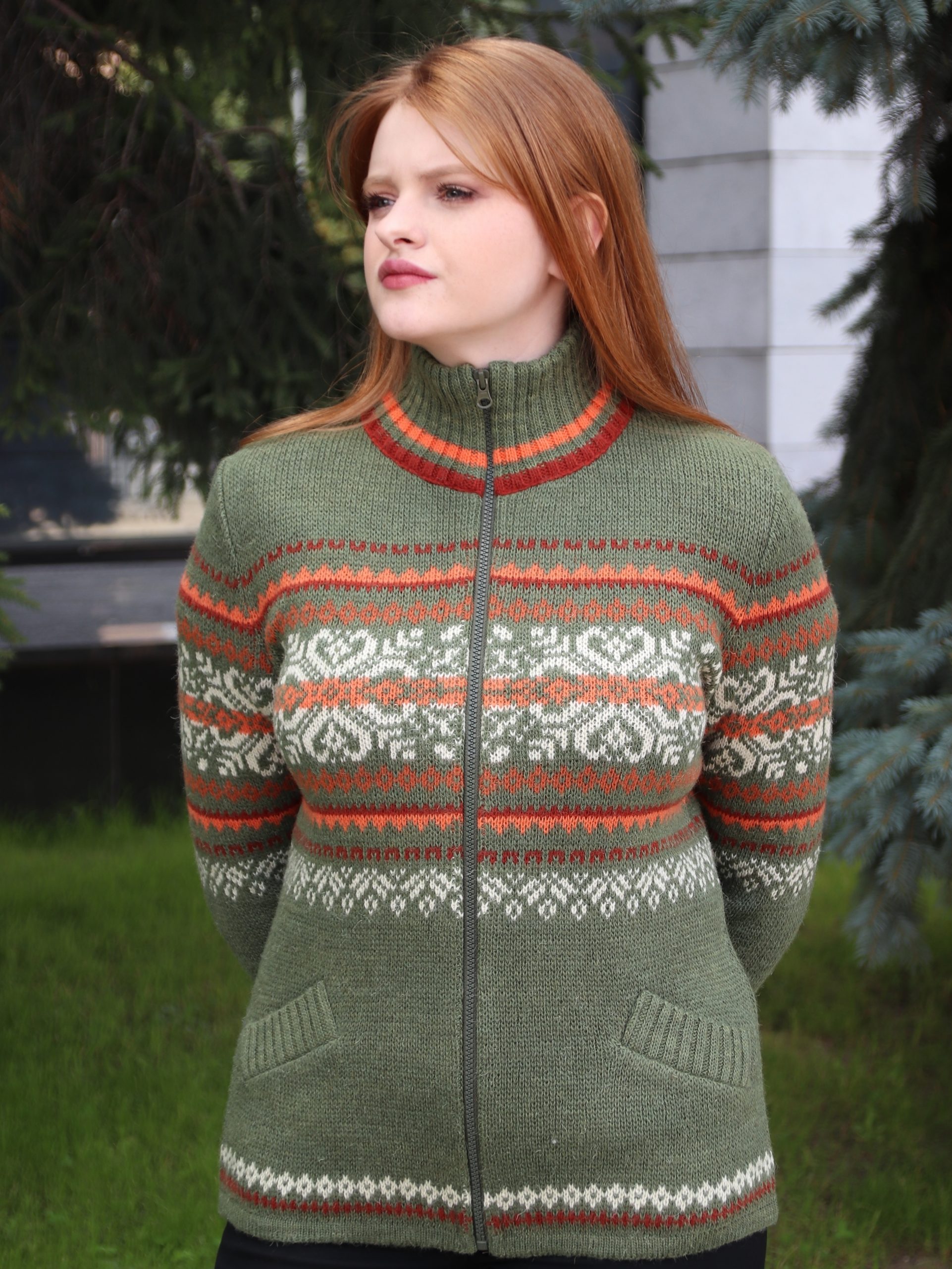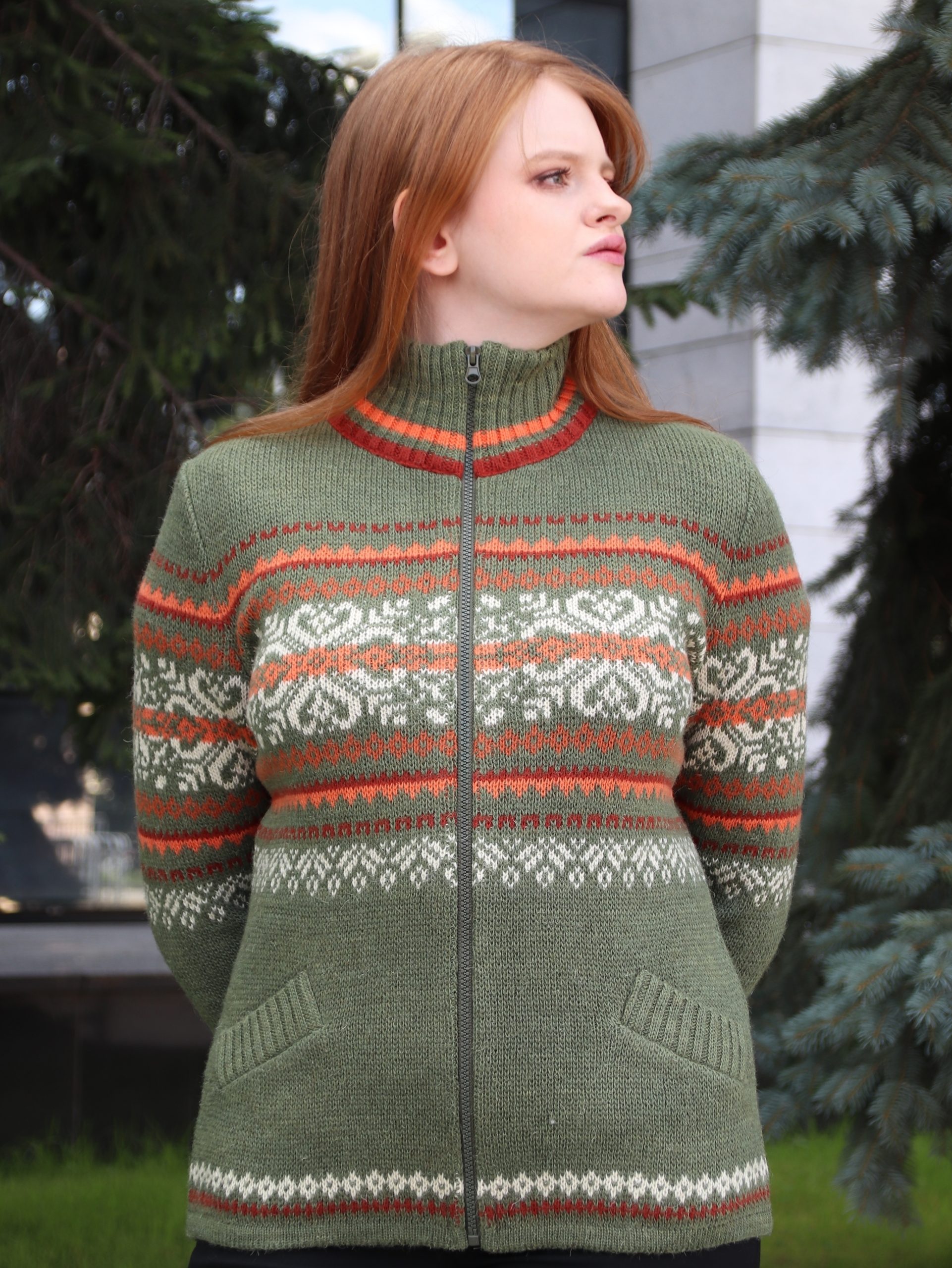 Шерстяной кардиган для женщин без капюшона, приталенный с втачными рукавами и карманами в рамку. Связан из 100% шерсти в спортивном стиле с жаккардовым рисунком.