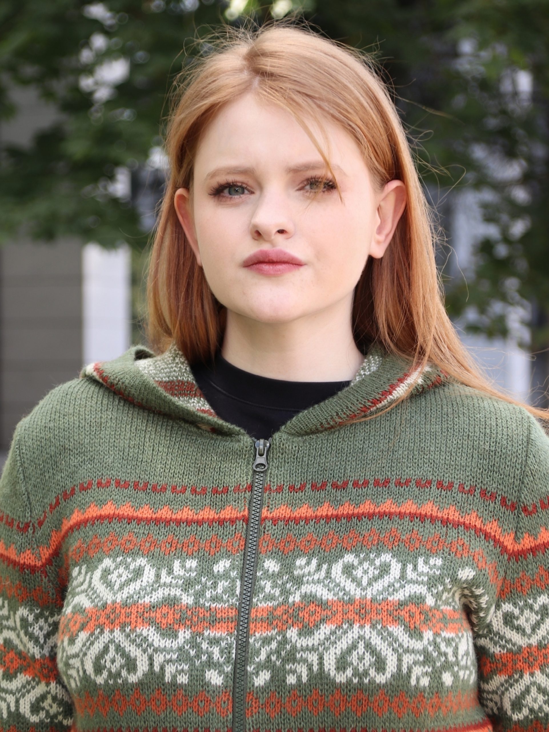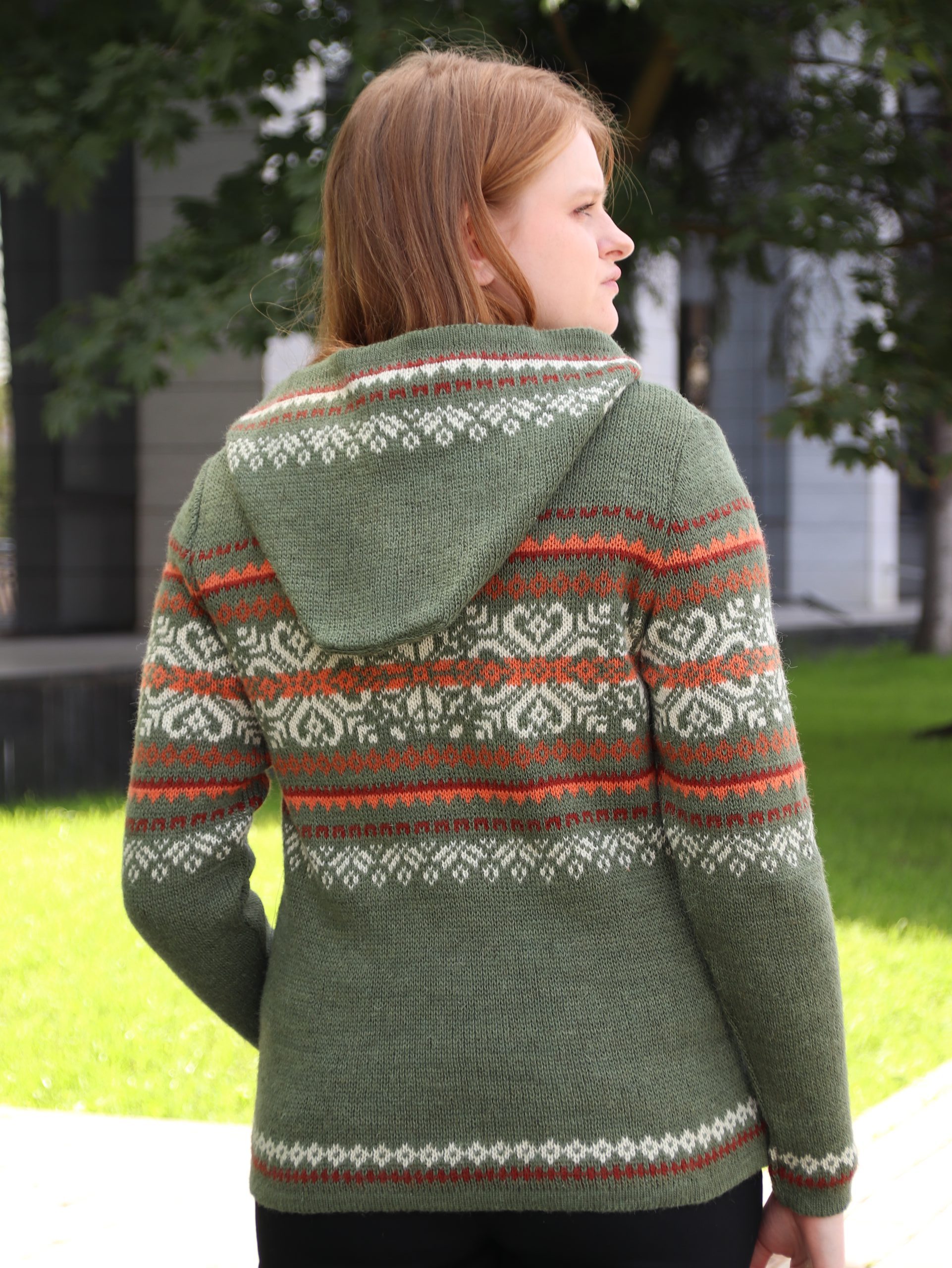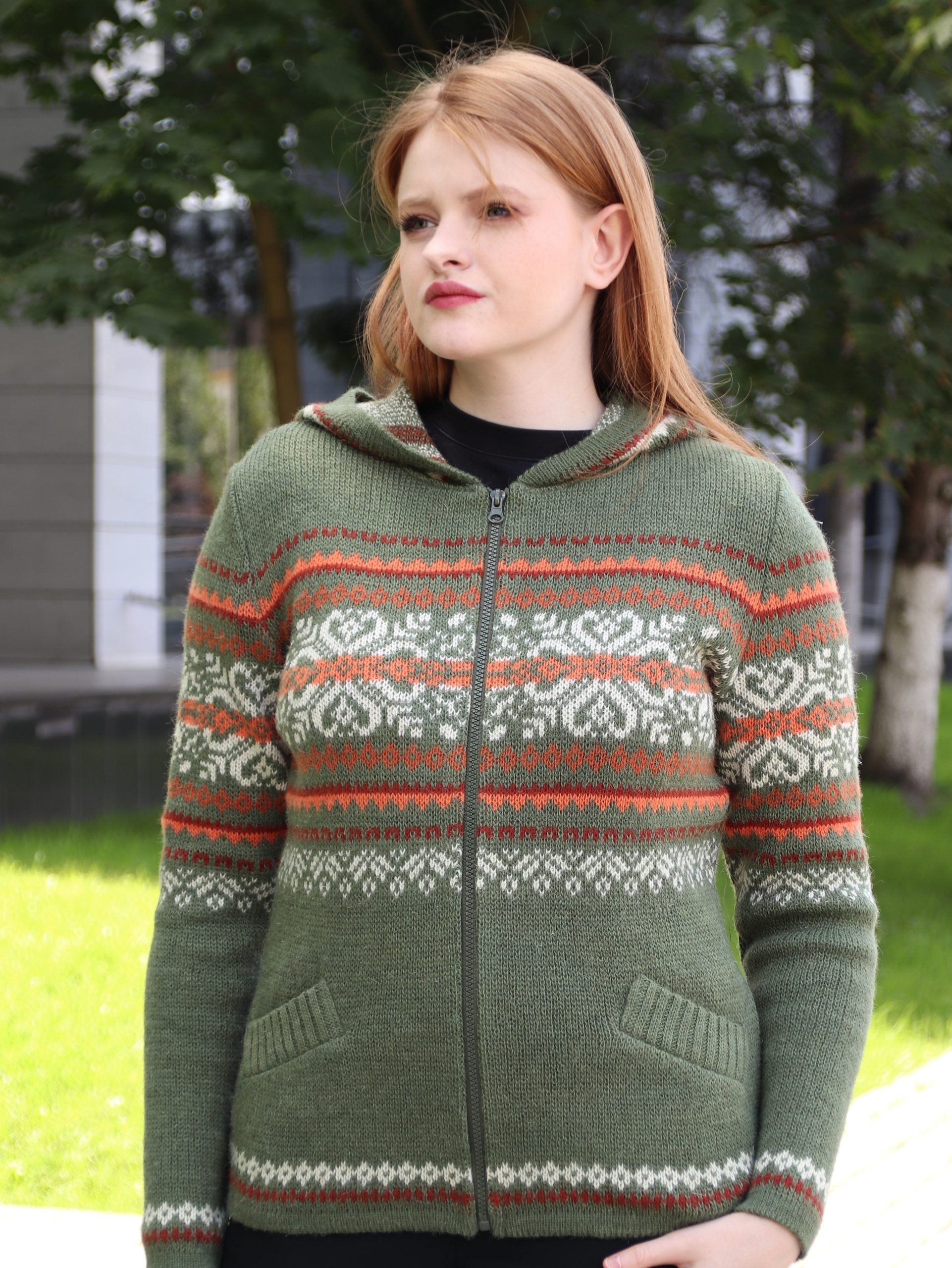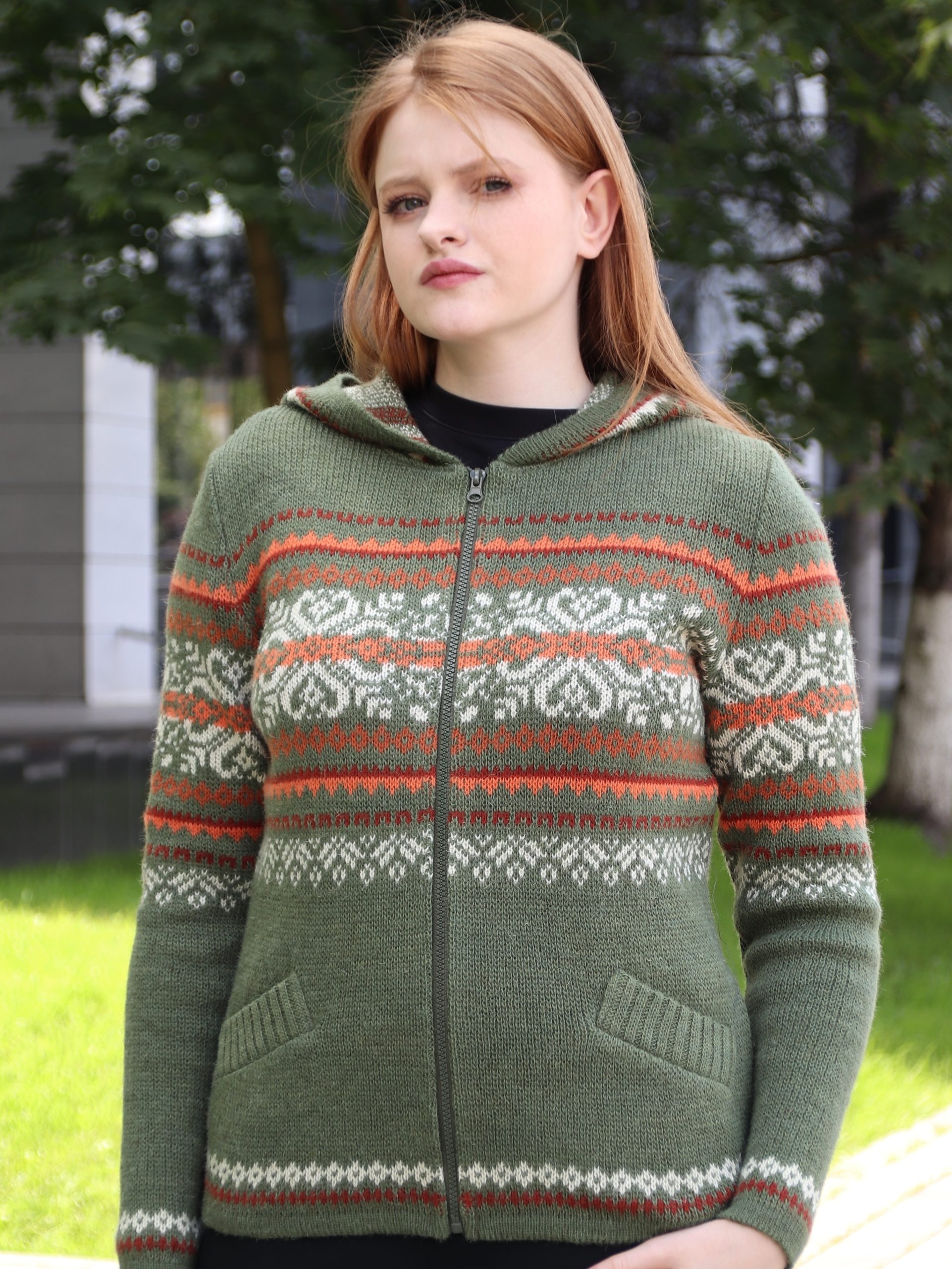 Шерстяной кардиган для женщин с капюшоном, приталенный с втачными рукавами и карманами в рамку. Связан из 100% шерсти в спортивном стиле с жаккардовым рисунком.