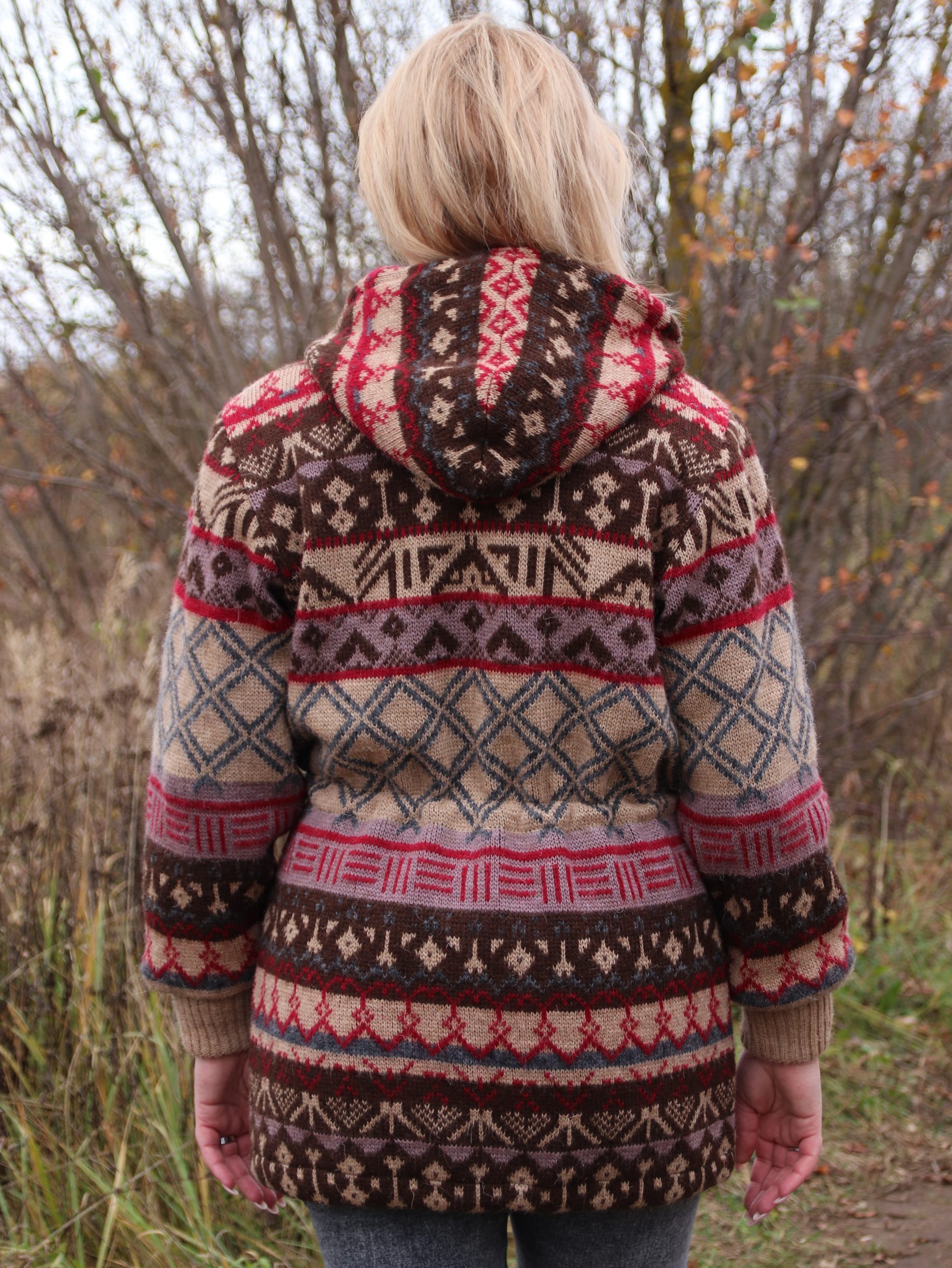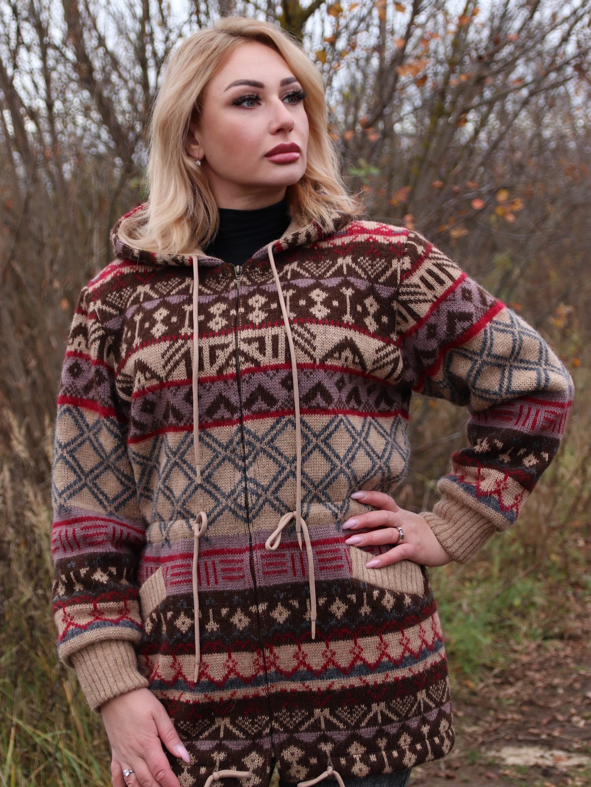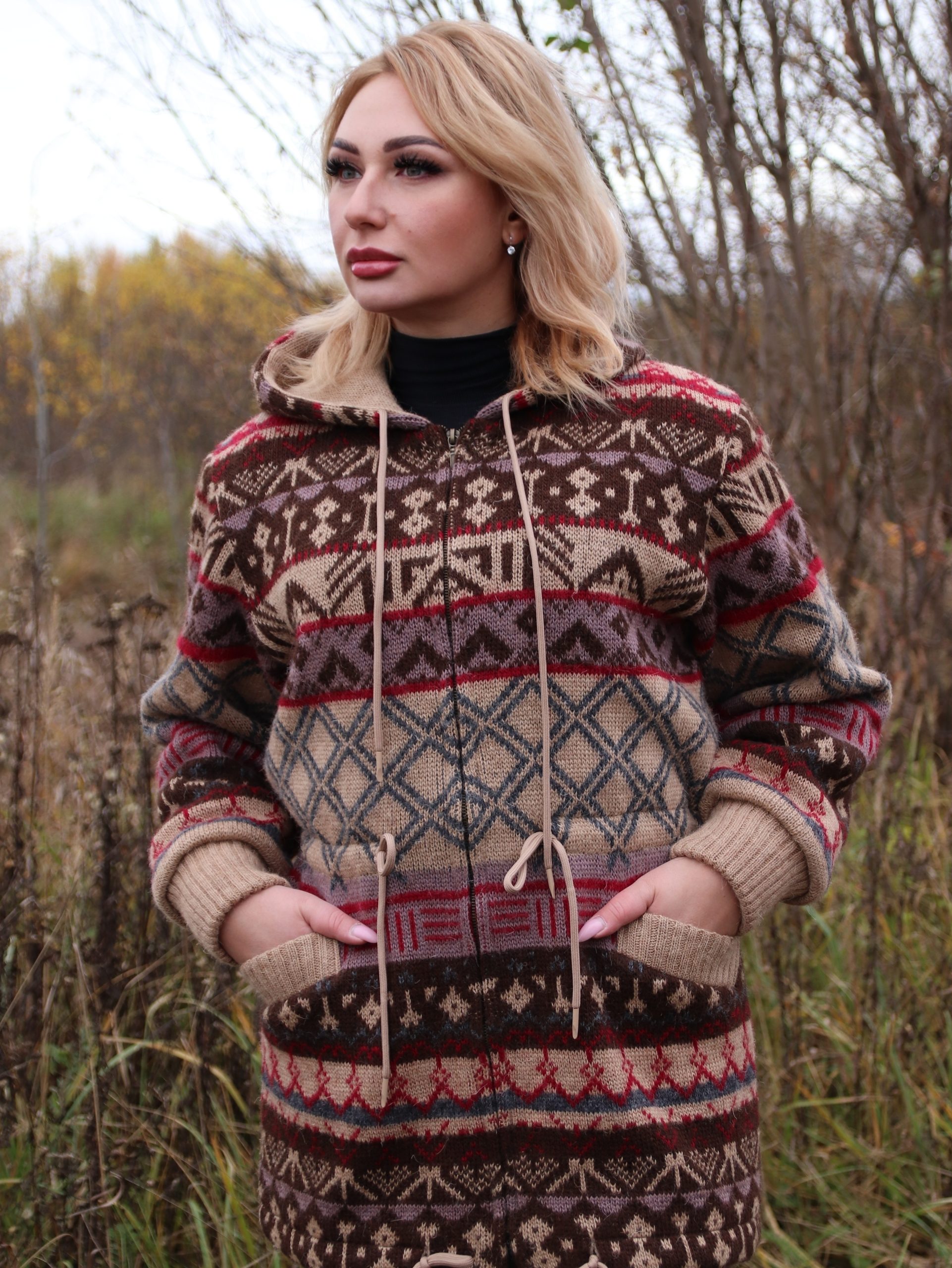 Теплый трикотажный жакет по типу куртки-парки с кулисой по линии талии на мембранной подкладке. Длинный жакет свободного силуэта с застёжкой на молнии, рукава рубашечного покроя, дополнен капюшоном и карманами. Вязаная шерстяная куртка с ворсом обладает отличными теплоизоляционными и влагоотталкивающими свойствами.