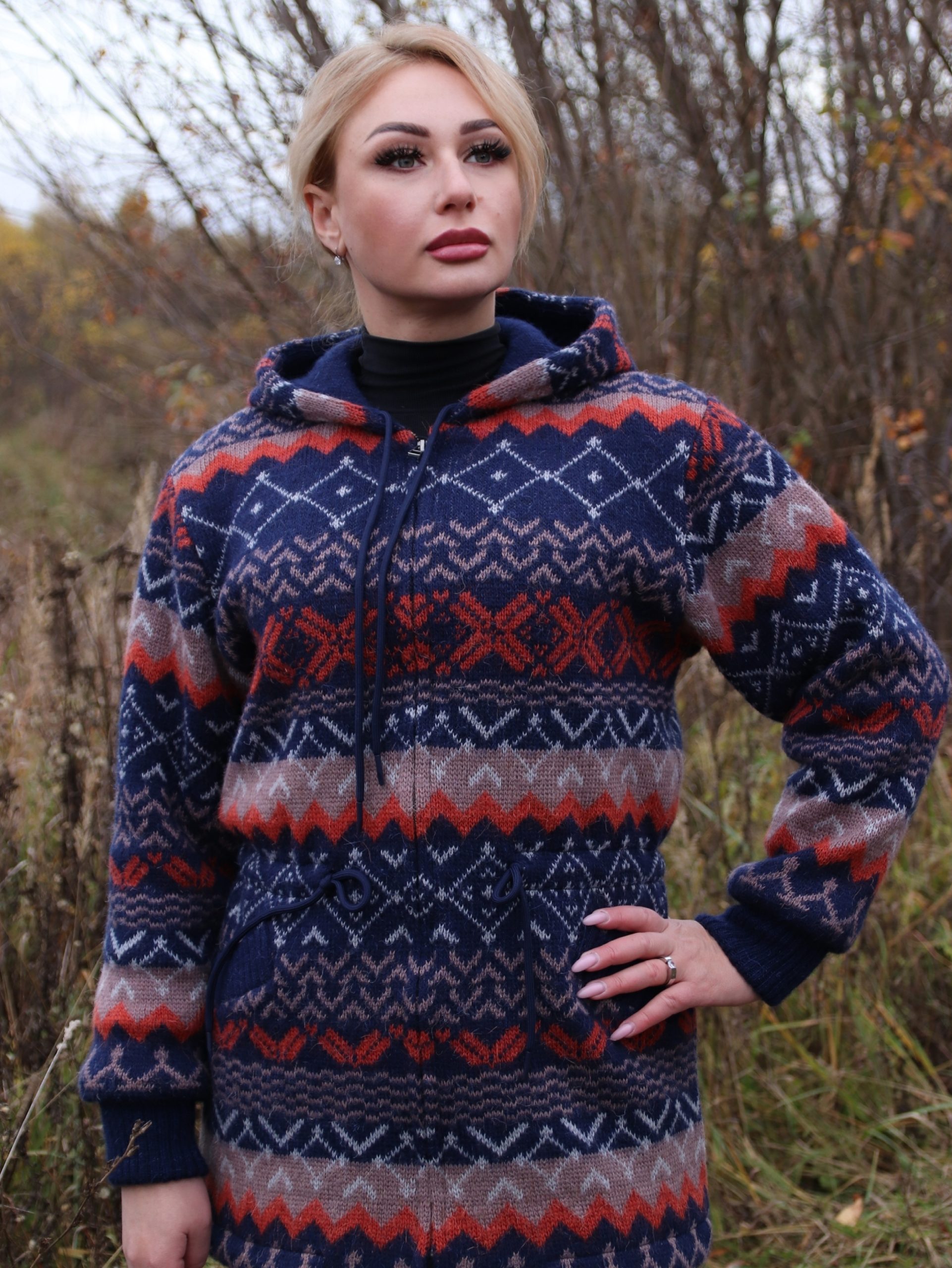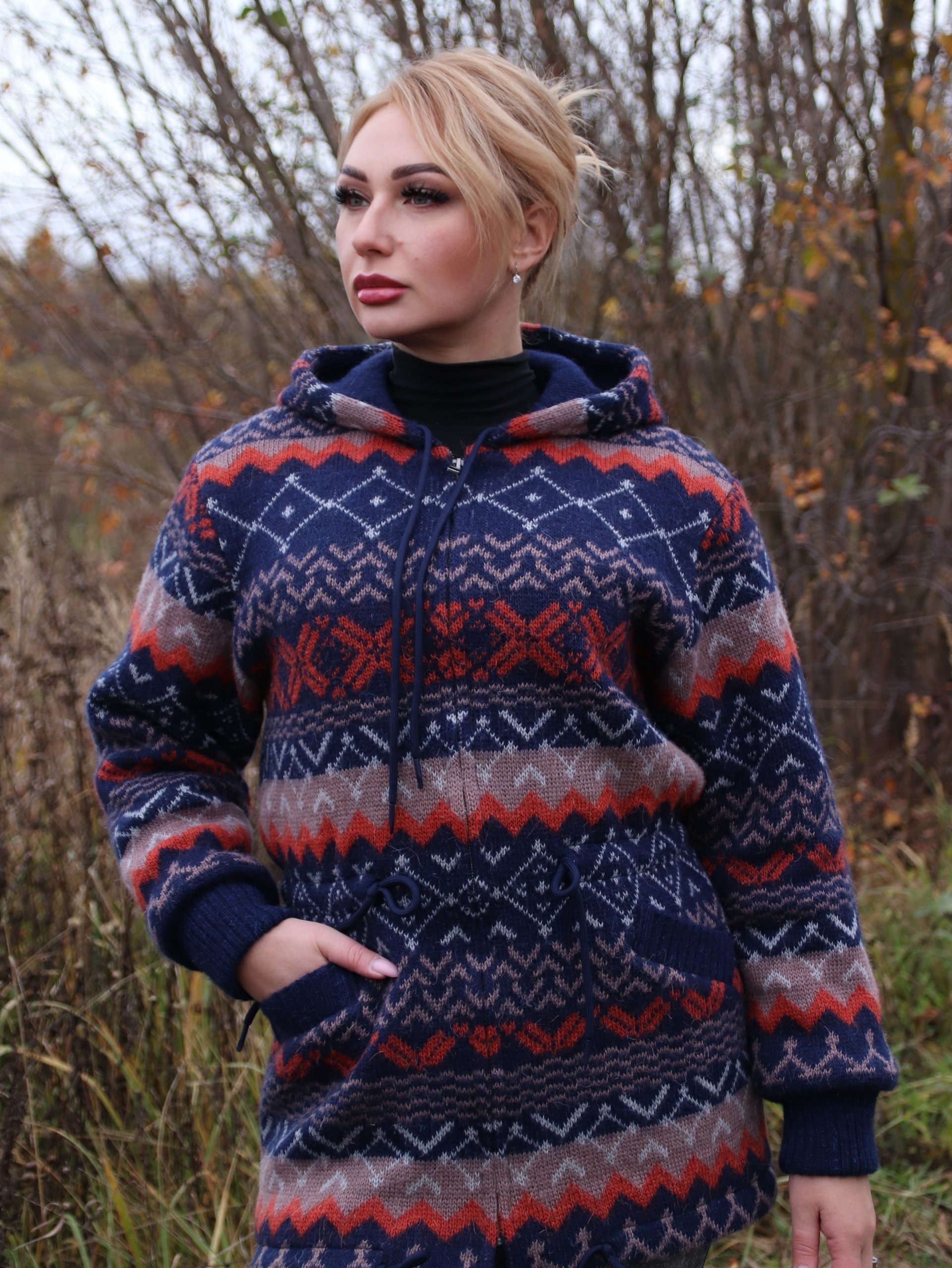 Теплый трикотажный жакет по типу куртки-парки с кулисой по линии талии на мембранной подкладке. Длинный жакет свободного силуэта с застёжкой на молнии, рукава рубашечного покроя, дополнен капюшоном и карманами. Вязаная шерстяная куртка с ворсом обладает отличными теплоизоляционными и влагоотталкивающими свойствами.
