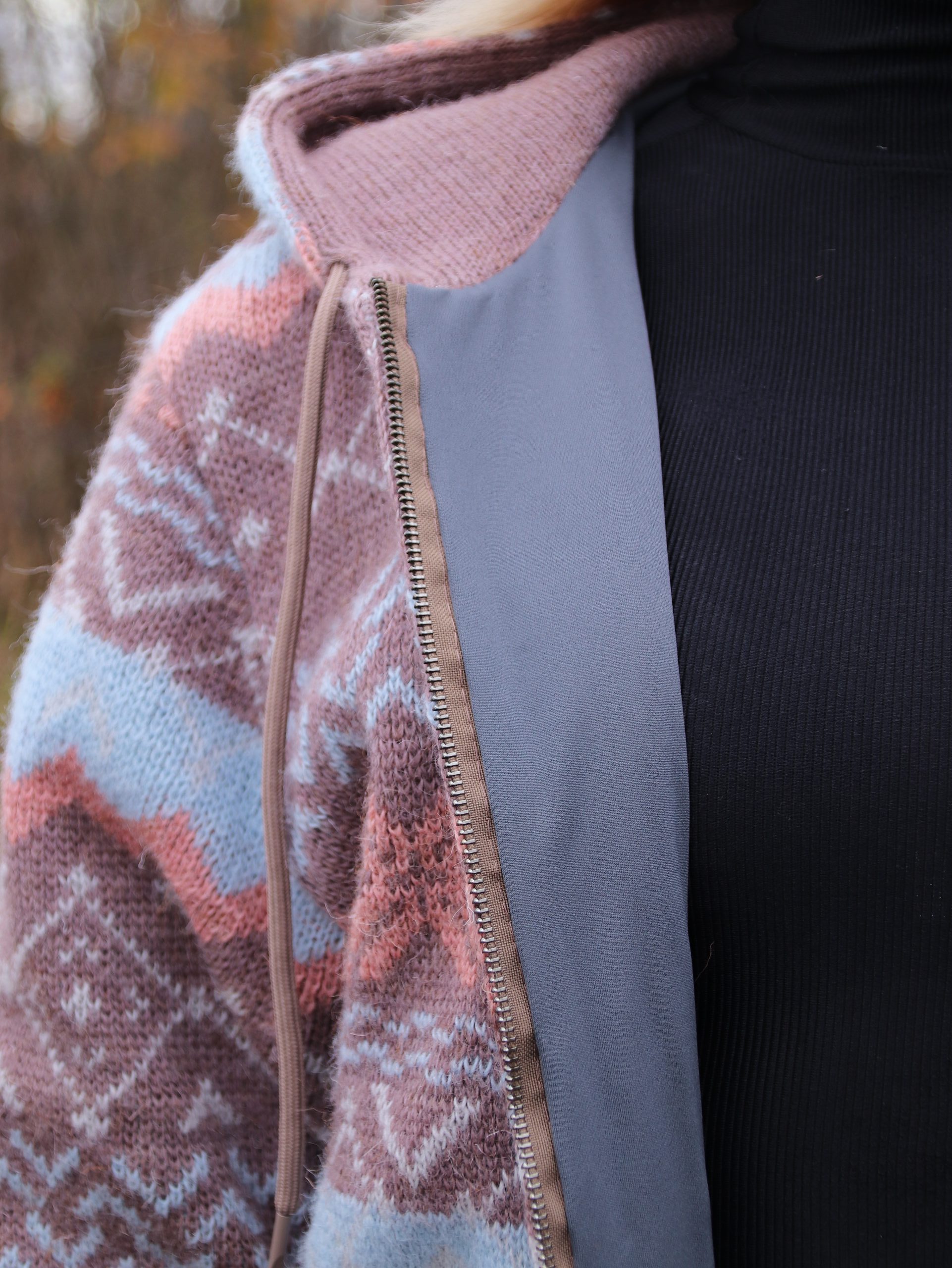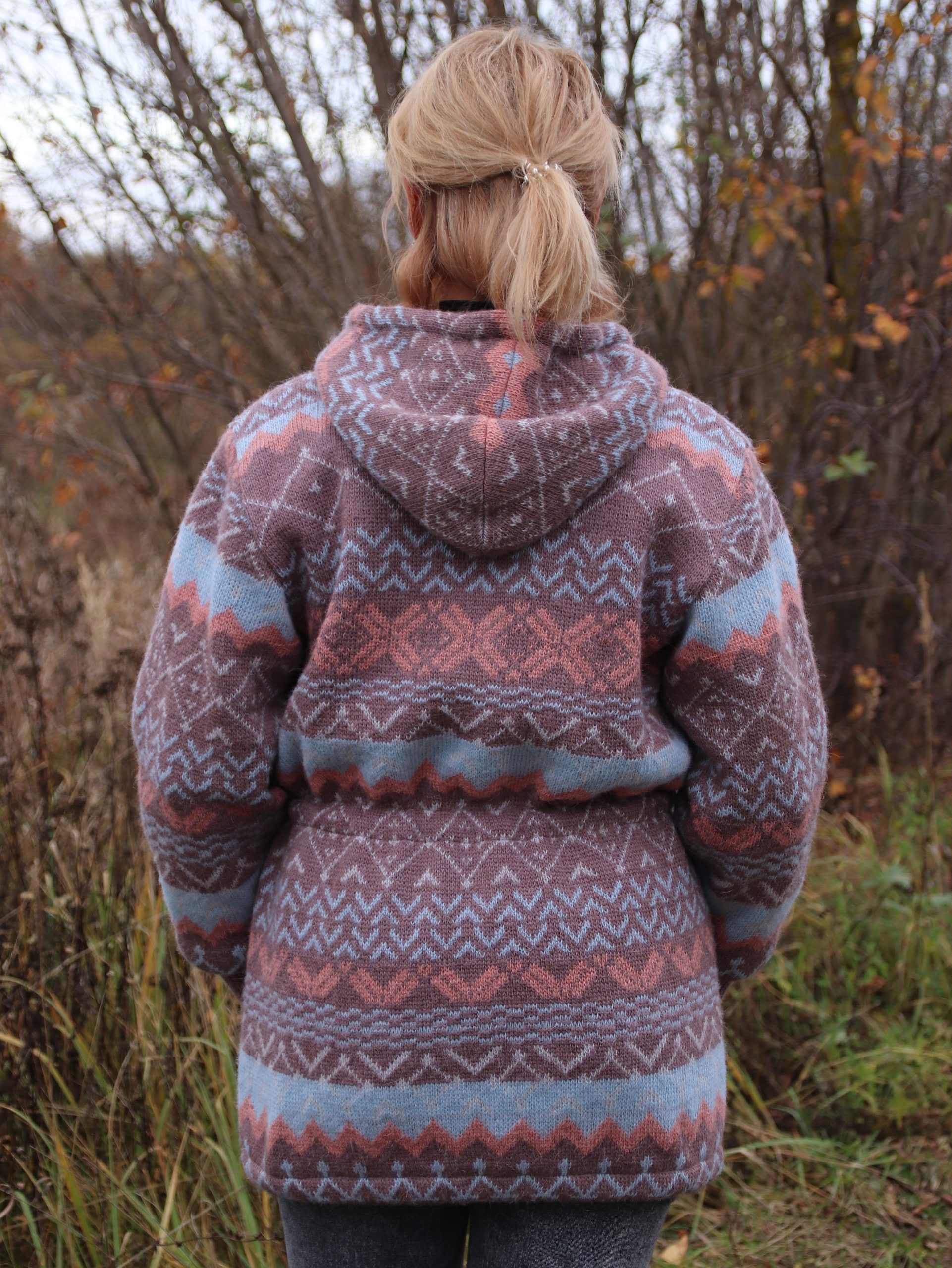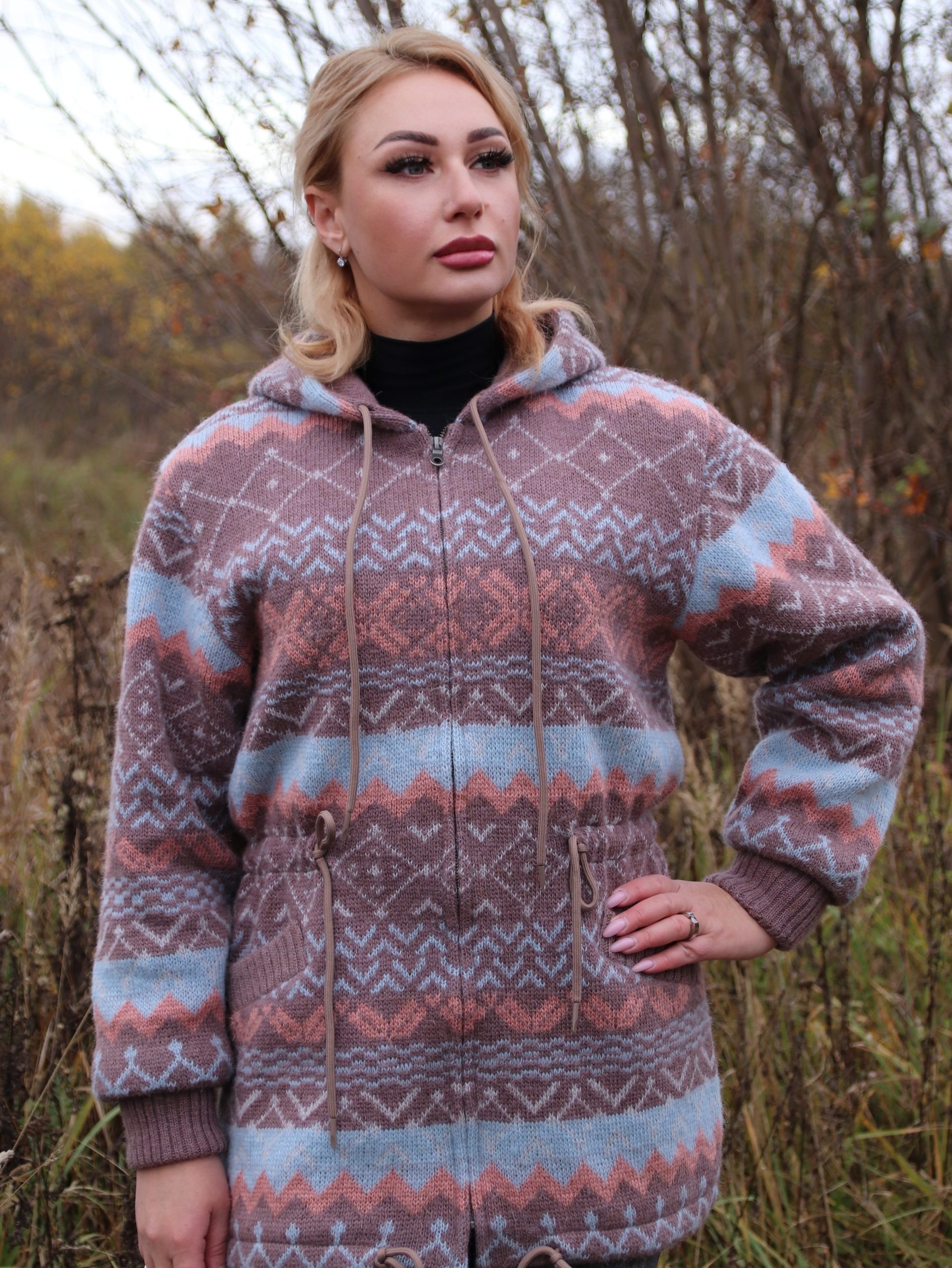 Теплый трикотажный жакет по типу куртки-парки с кулисой по линии талии на мембранной подкладке. Длинный жакет свободного силуэта с застёжкой на молнии, рукава рубашечного покроя, дополнен капюшоном и карманами. Вязаная шерстяная куртка с ворсом обладает отличными теплоизоляционными и влагоотталкивающими свойствами.