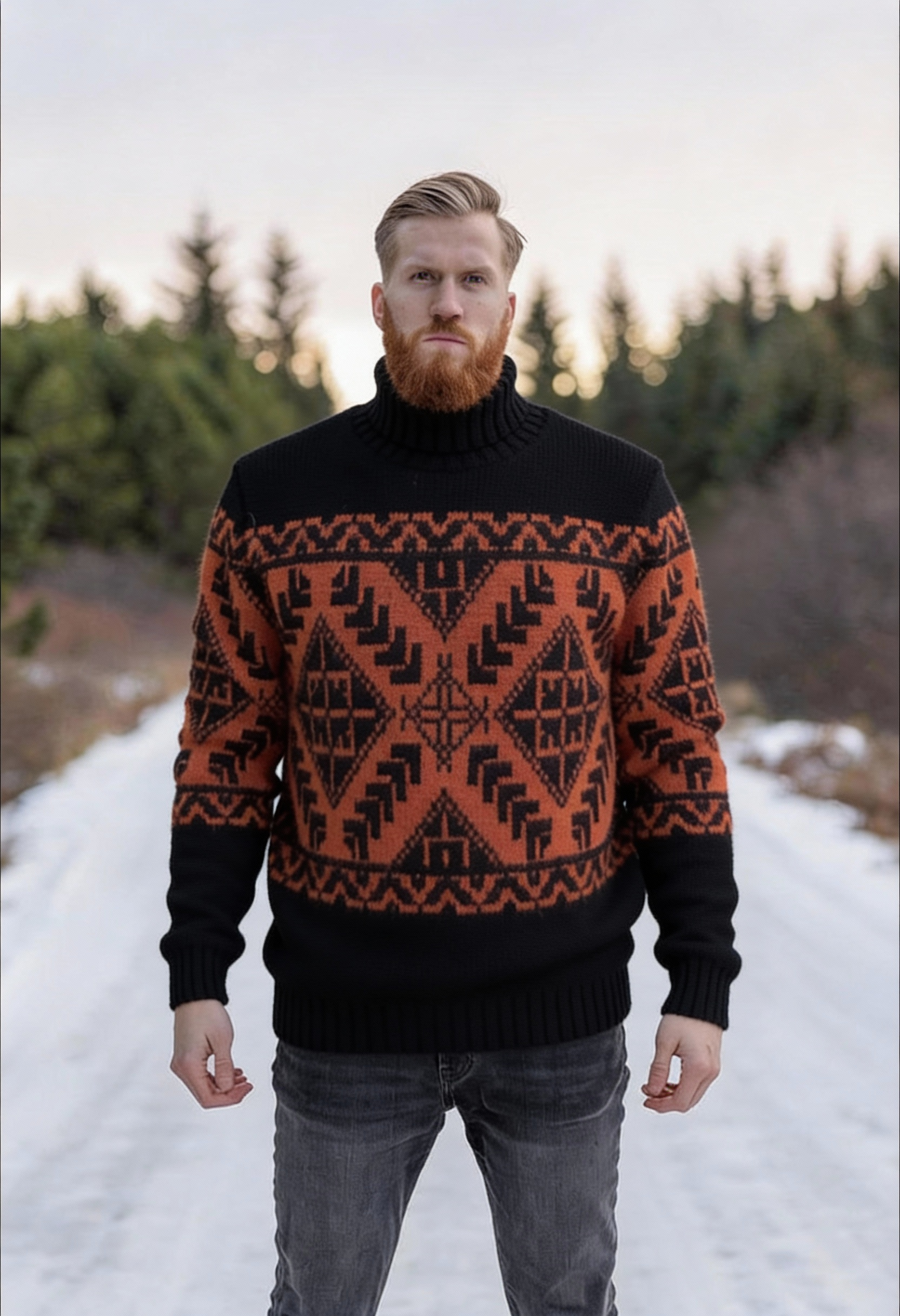 Мужской вязаный свитер из исландской 100% шерсти с воротником и длинными рукавами. Зимний свитер с горлом изготовлен с узорами в исландском стиле.