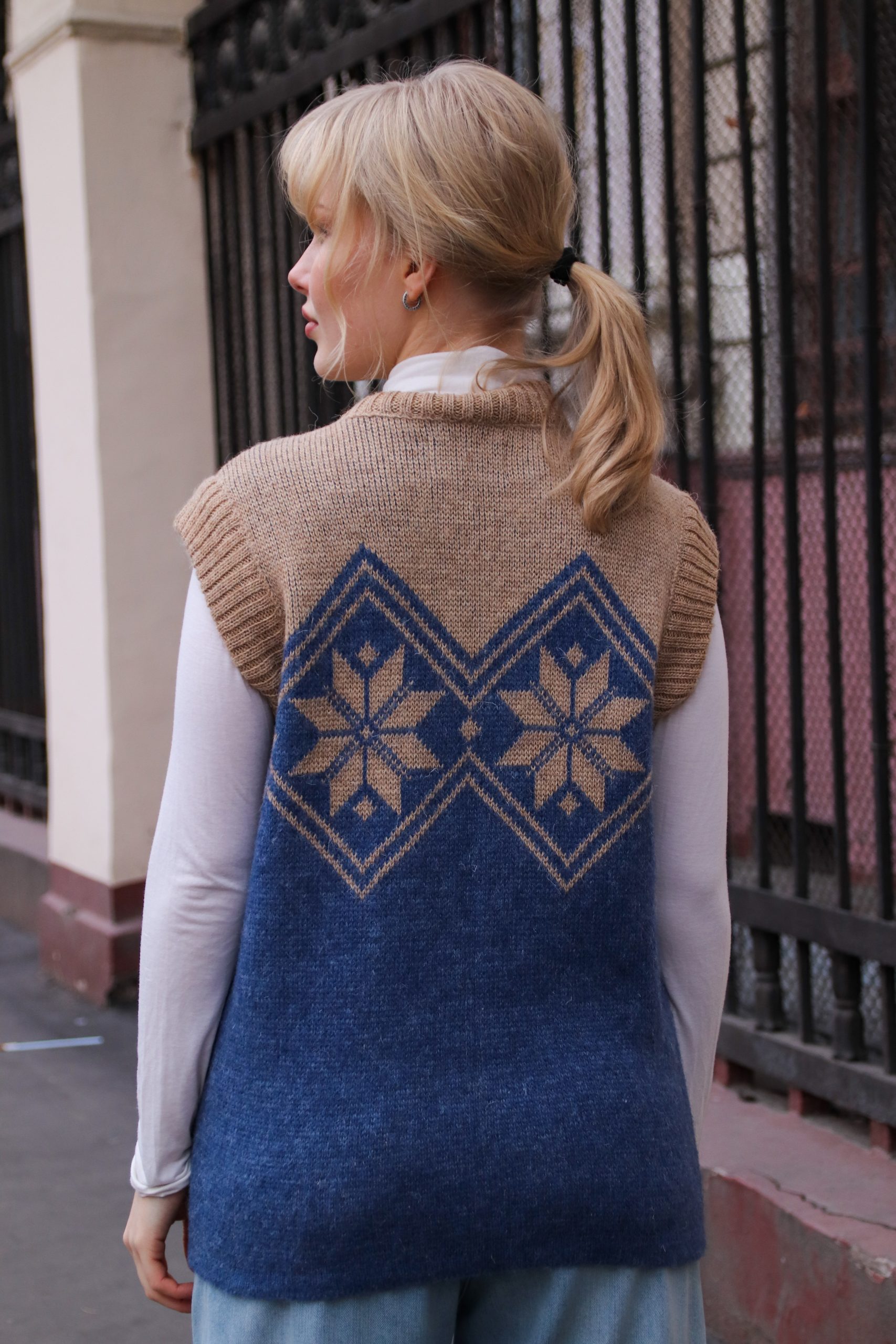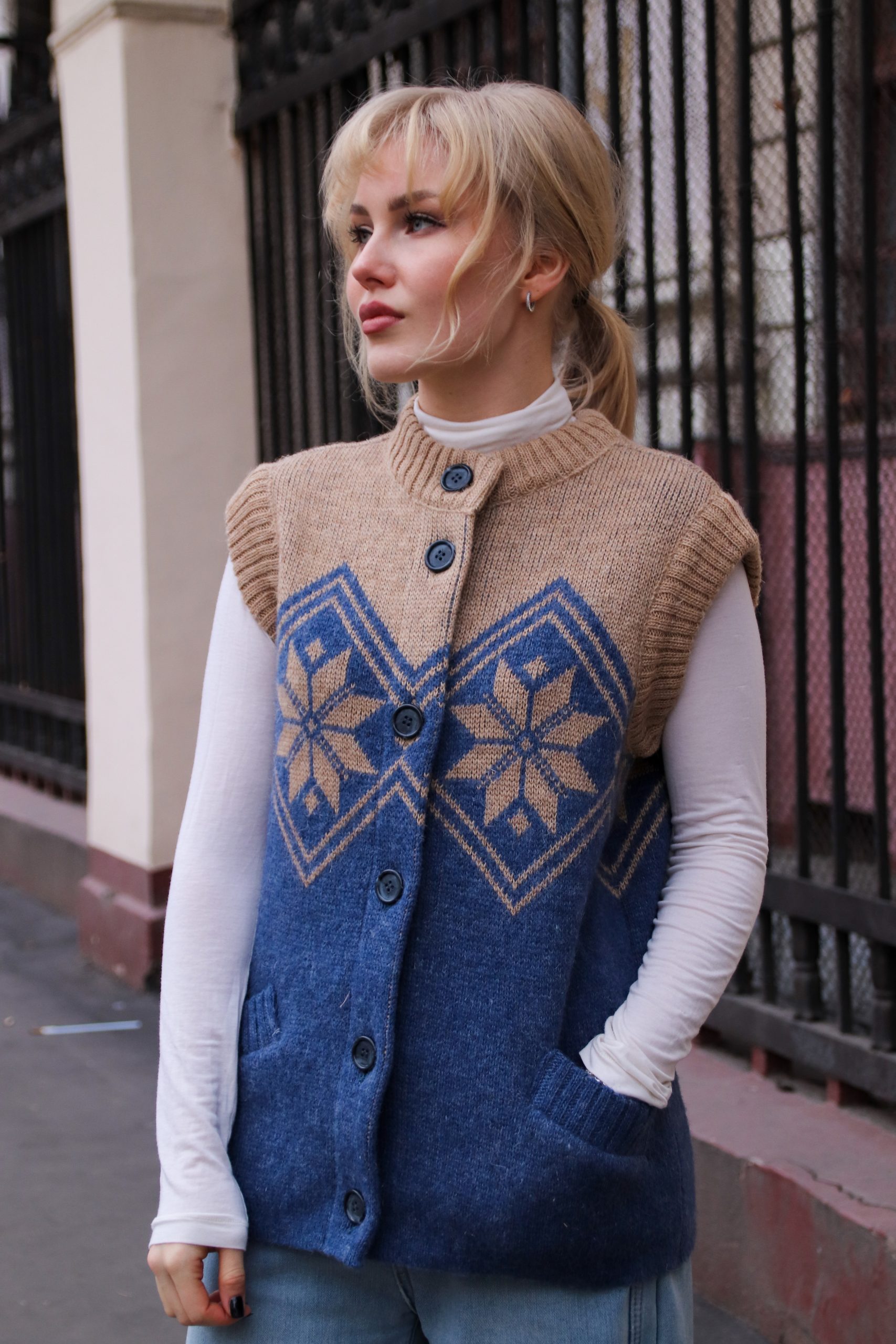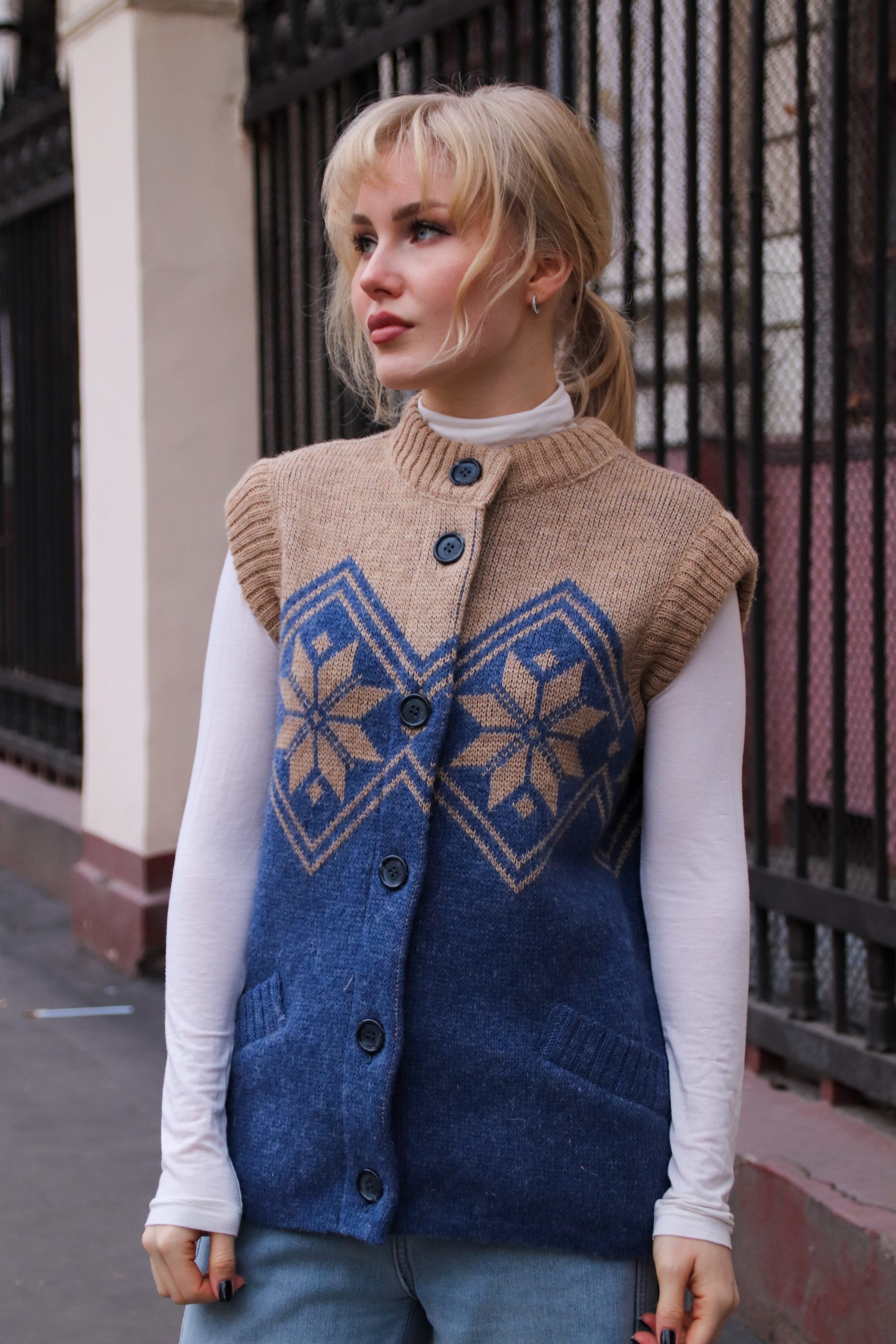Теплый жилет для женщин из натуральной шерсти в исландском стиле. Вязаный жилет безрукавка на пуговицах, дополнен карманами в рамку.